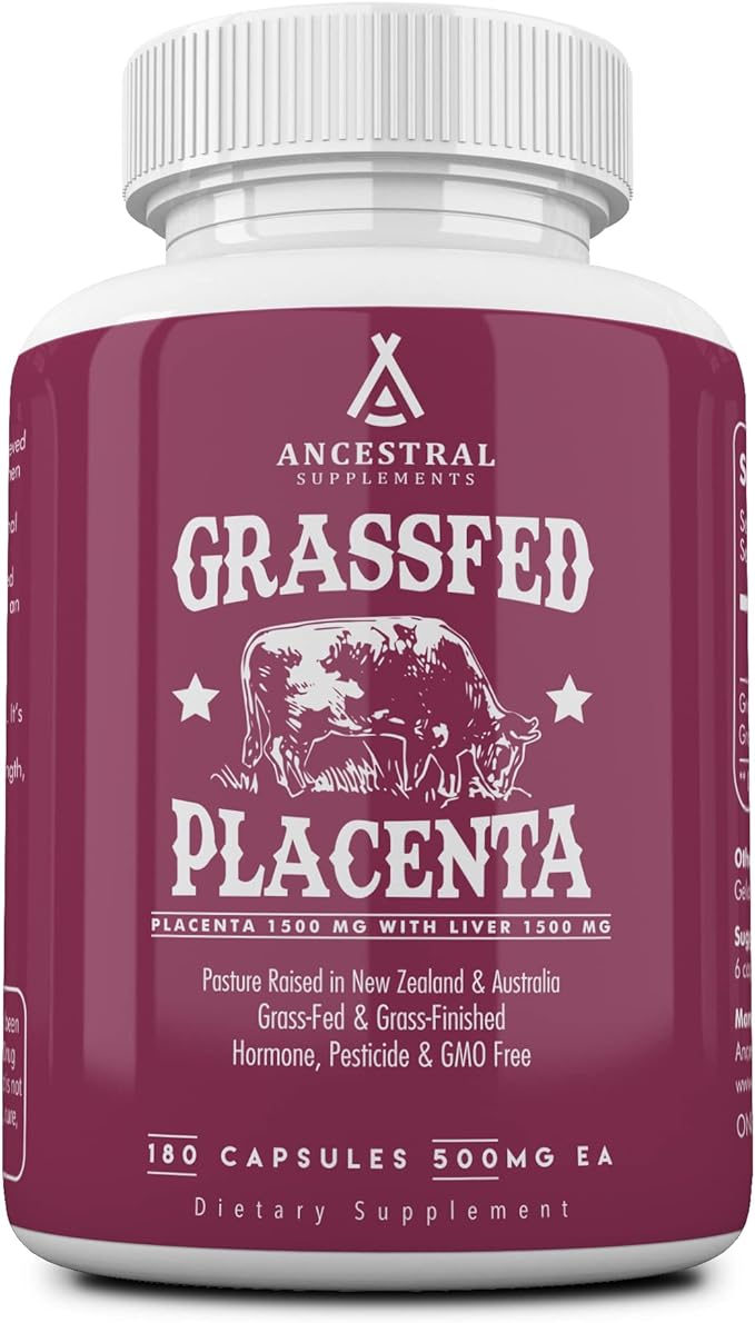Ancestral Supplements Grass Fed Placenta Supplement with Liver, Contains Postpartum Vitamins for Women Breastfeeding, Promotes Menopause Relief, Stem Cells Support Skin Elasticity, 180 Capsules