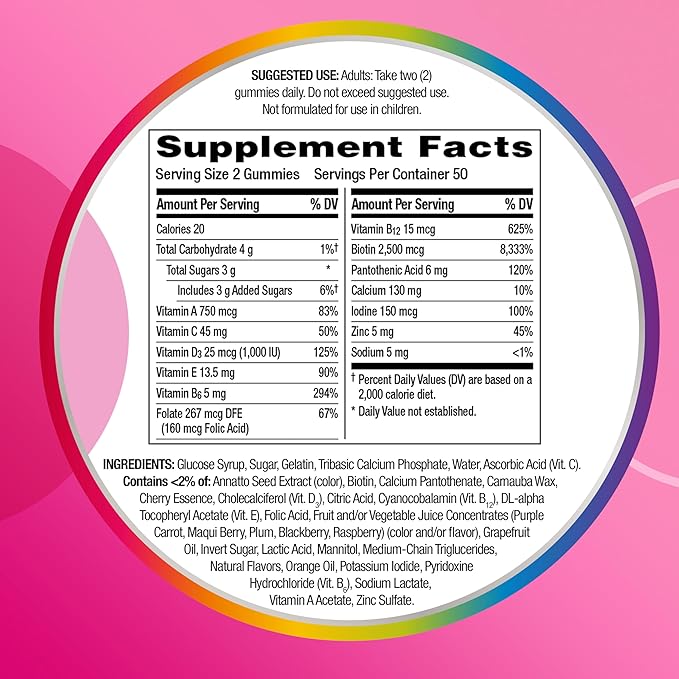 - Gummies with a combination of vitamins A, C, E and biotin to support healthy hair, skin, and nails (1, 5)