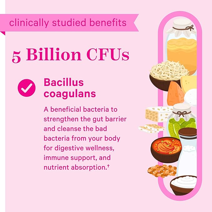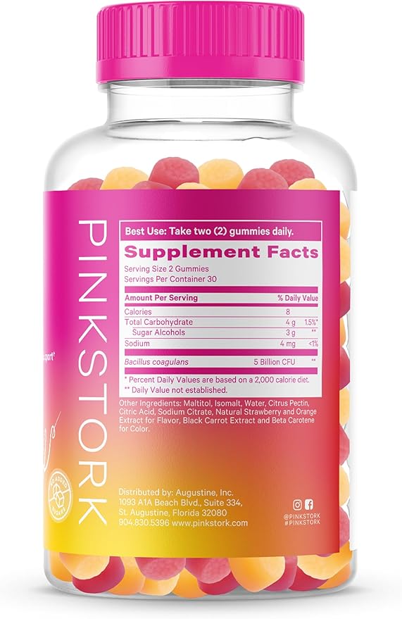 - Probiotics for Women: Pink Stork Probiotic Gummies offer 5 billion CFUs of Bacillus coagulans strain probiotics in a delicious sugar-free, vegan gummy! Daily consumption of probiotics supports the good flora in your microbiome -- essential for your overall wellness - great for mood health, bowel regularity, cognitive function (through the Gut-Brain Axis), pH balance for women, and digestion (including occasional morning sickness, bloating, heartburn, constipation, and gas).