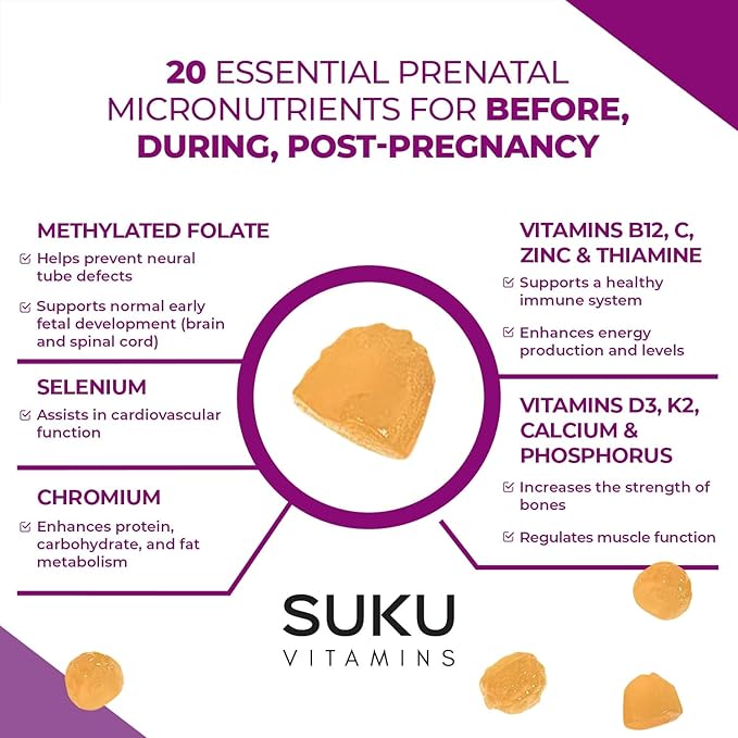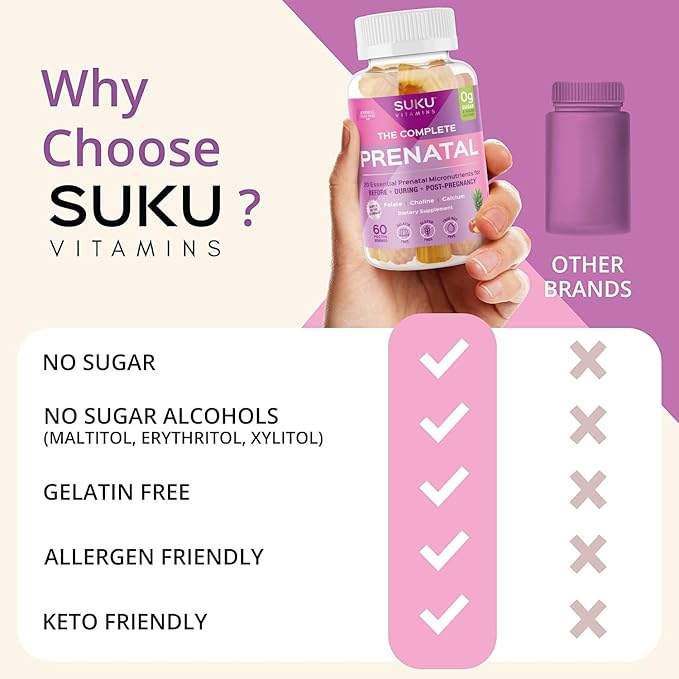 - Easy to Take Nutrients - No more drips and spills with Suku Vitamins’ complete prenatal vitamin gummies. Enjoy the goodness of our keto-friendly, vegetarian vitamins, which taste like candy!