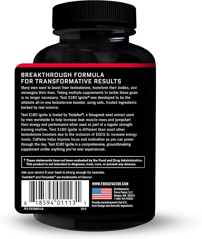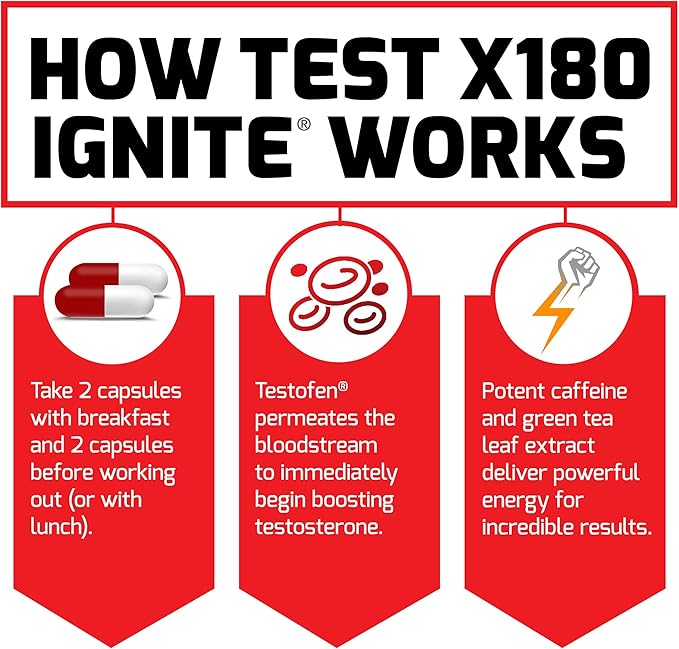 - Boost total testosterone: increasing total testosterone is the answer for men who want to build muscle and take charge. Test x180 Ignite contains Testofen, a specialized Fenugreek Seed extract, to help you feel like a superhero in the gym again.