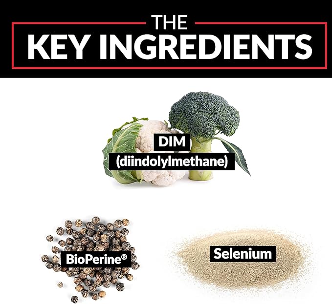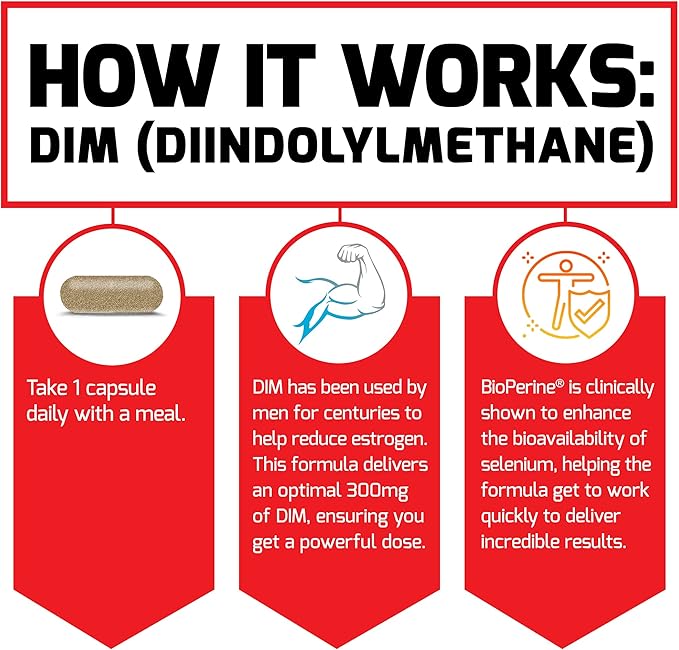 - DECREASE ESTROGEN: DIM, short for dinndolymethane, is a unique compound believed to help decrease estrogen levels in men. At concentrated amounts, DIM is thought to work by inhibiting the enzyme responsible for converting testosterone into estrogen.