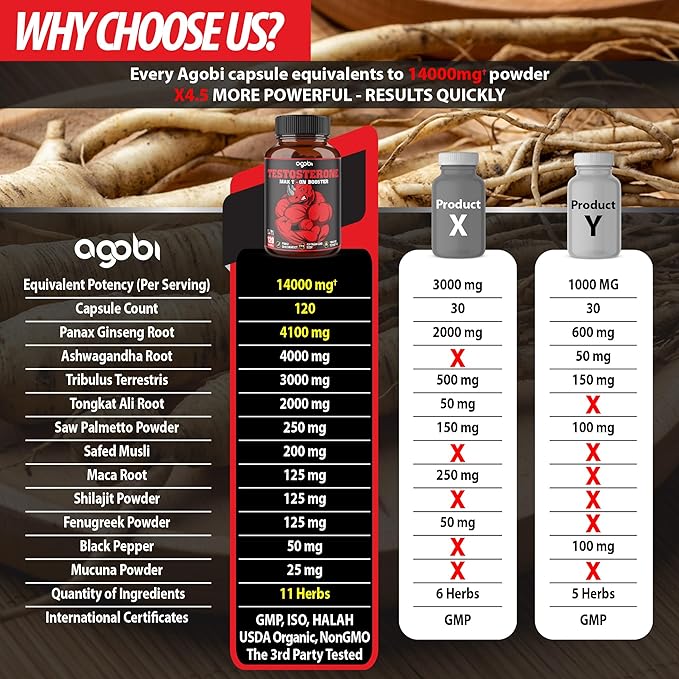 - ✅ Superior Strength: Agobi capsules all ingredients. Specially, our Ginseng, Ashwagandha, Tribulus are 10:1 Concentrated, more than 5:1 from others. Support always "On" status.