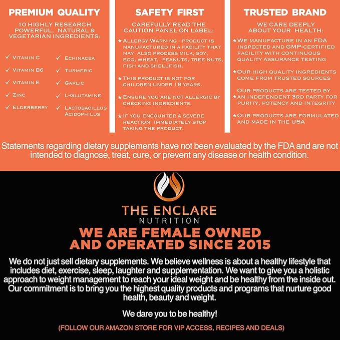 THE ENCLARE NUTRITION Immune Support Vitamins with Vitamin C, Elderberry, Zinc, Echinacea, Turmeric Curcumin, Garlic. 10in1 Immunity Defense Supplement Booster for Adults. Veg Capsules 60ct (3)