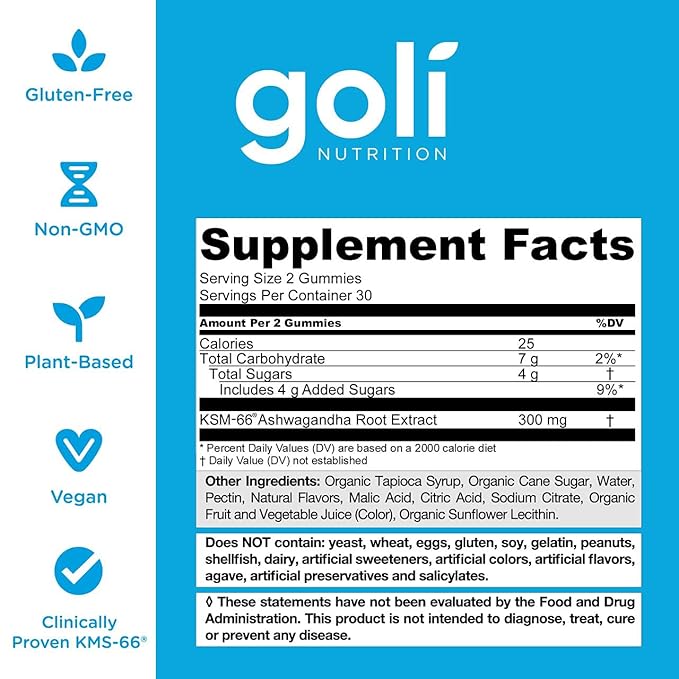 - Vegan, Non-GMO, Gluten-free & Gelatin-free: Each bottle of Goli Ashwagandha contains 60 delicious vegan, non-gmo, gluten-free & gelatin free Ashwa gummies.