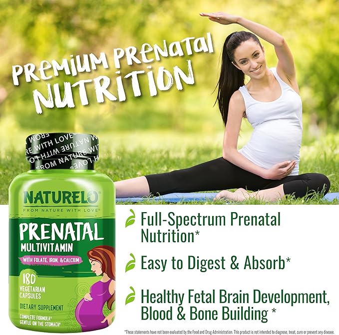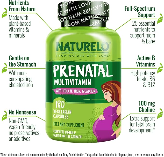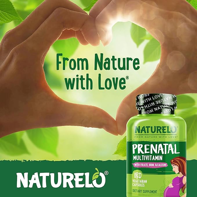 NATURELO Prenatal Multivitamin with Gentle Chelated Iron, Methyl Folate, Plant Calcium & Choline - Vegan, Vegetarian - Non-GMO - Gluten Free - 360 Capsules - 4 Month Supply
