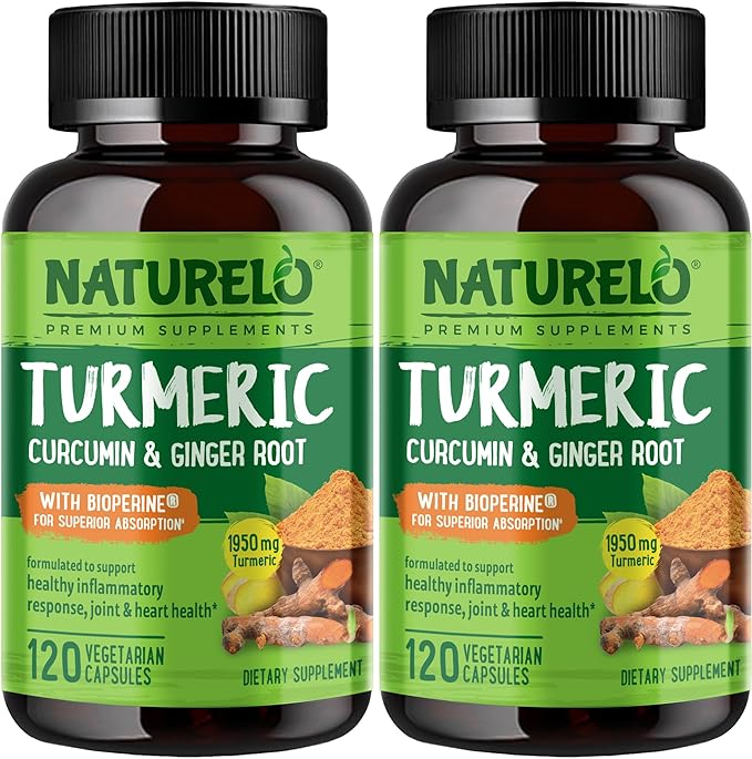NATURELO Turmeric Curcumin with BioPerine - Ginger Root, Black Pepper, Curcuminoids - Relief for Stiff, Sore Joints - 120 Vegan Capsules (2 Pack)