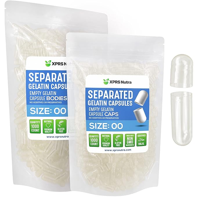 XPRS Nutra Gelatin Size 00 Separated Capsules - 1000 Count Gelatin Empty Capsules Separated in Bags - Separated Empty 00 Capsules - Pill Capsules DIY