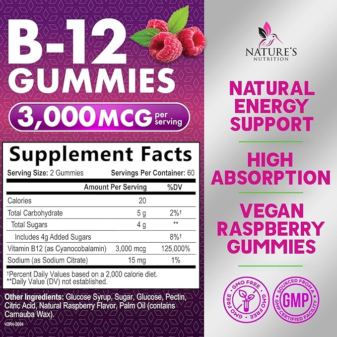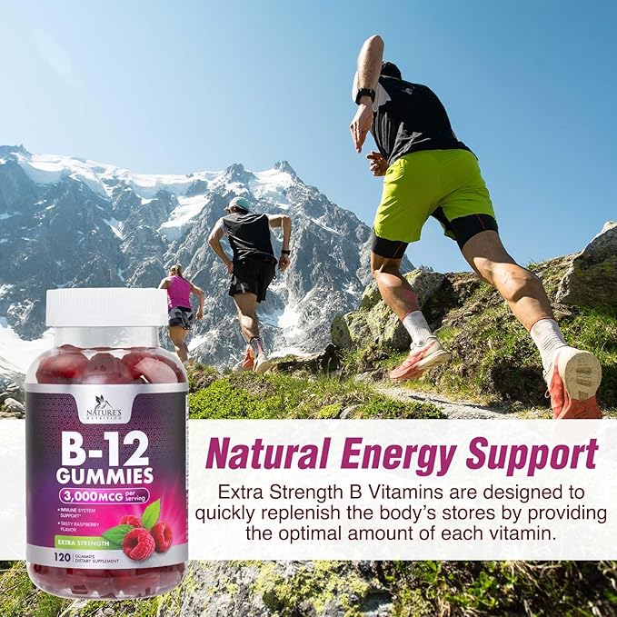 - B12 Energy Gummies by Nature's Nutrition: b12 energy over 1000 12 3000 5000 5000mcg for adults b b13 bitamin chewable gummies gummy mcg pills supplement supplements vitamin vitaminas vitamins women and 30 45 90 day supply complex extra system 100 count strength per s serving tablets 2 2500 flavored 1 500 servings cherry dietary health high with immune support raspberry