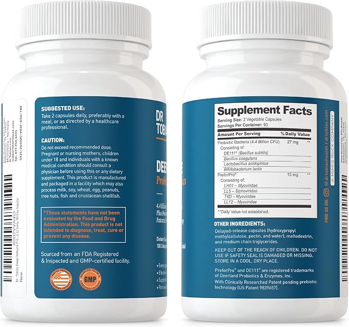 Dr. Tobias Deep Immune Probiotics & Prebiotics, 4.4 Billion CFU Probiotics for Women & Men, Supports Digestive Health, Gut Immune Function, Nutrient Absorption, 180 Capsules, 90 Servings