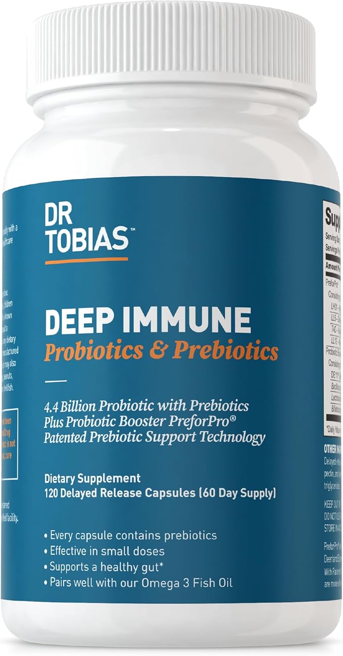 Dr. Tobias Deep Immune Probiotics & Prebiotics, 4.4 Billion CFU Probiotics for Women & Men, Supports Digestive Health, Gut Immune Function, Nutrient Absorption, 120 Capsules, 60 Servings