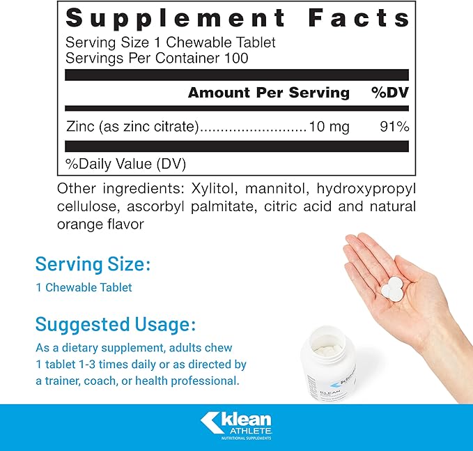 Klean ATHLETE Klean Zinc | Support for Immune System Function | NSF Certified for Sport | 100 Chewable Tablets | Natural Orange Flavor