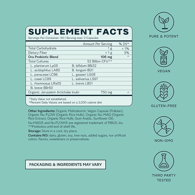 Ora Organic Probiotics with Prebiotics - 52 Billion CFU 11 Clinically Studied Strains for Digestive Health, Trust Your Gut, Gluten Free, 60 Capsules