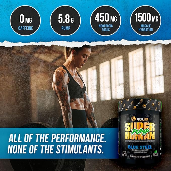 ALPHA LION Superhuman Pump Pre Workout Powder, Nootropic Caffeine & Stim Free Preworkout Supplement, Nitric Oxide Booster, Muscle Gainer, Energy & Focus (42 Servings, Blueberry Steel Flavor)