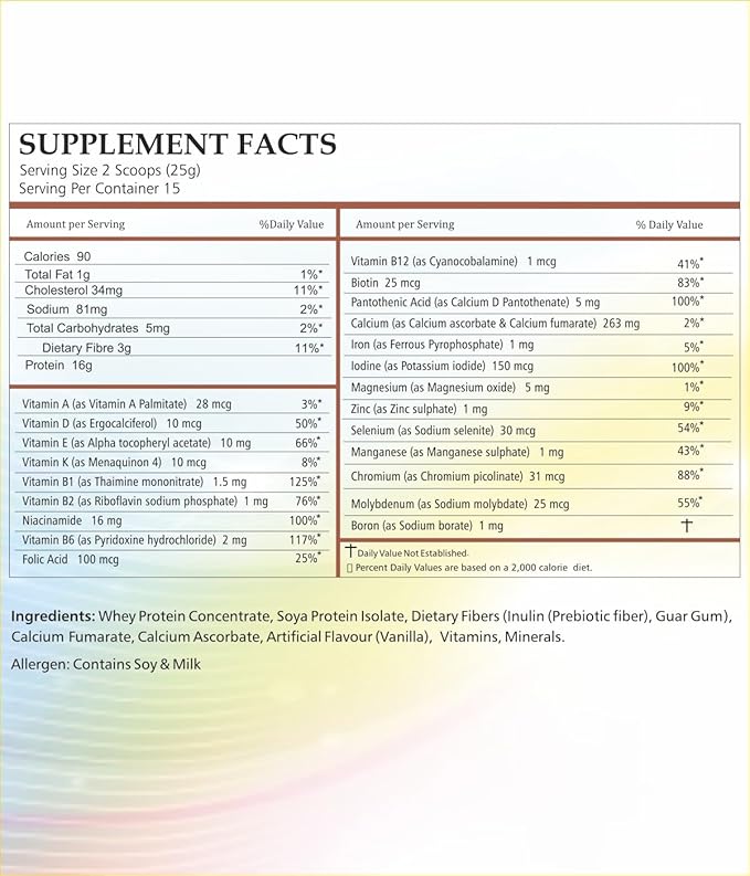 - TASTE BEST PROTEIN POWDER: Makes a Delicious Vanilla Protein Shake with HIGH QUALITY SUSTAINED RELEASE PROTEINS (63g/100g), from plant & dairy source with PDCAAS score of 1, offering complete amino acid profile exerting less load on the gut. This Comprehensive blend with 24 Crucial Vitamins Minerals, Antioxidants & Dietary Fiber (11g/100g) including Prebiotic FOS can support various physiological processes, overall health & help promote good gut flora & satiety without bloating. Added NO Sugar, NO Artificial Sweetener, NO Maltodextrin.