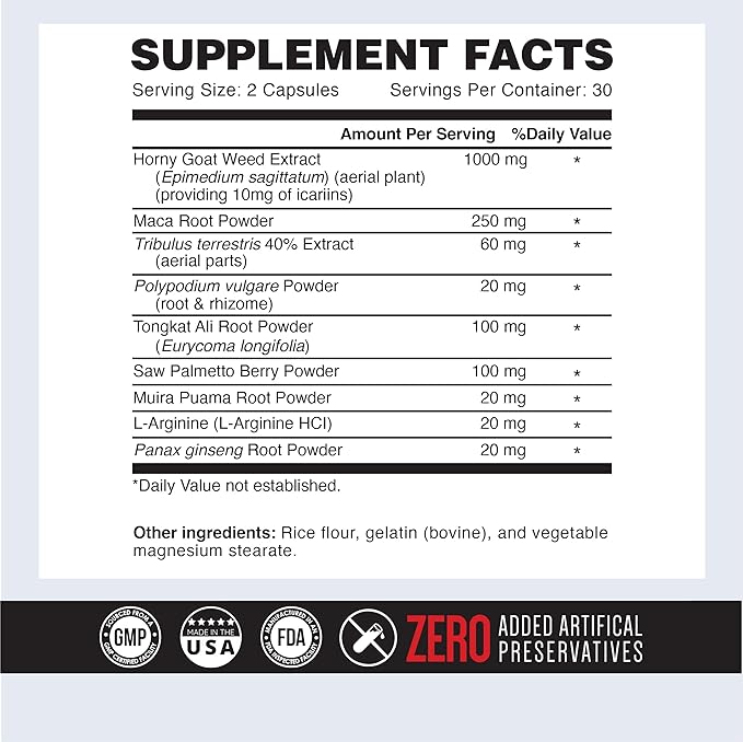 - Special Ingredients : Tribulus Terrestris, Horny Goat Weed, Maca Root Powder