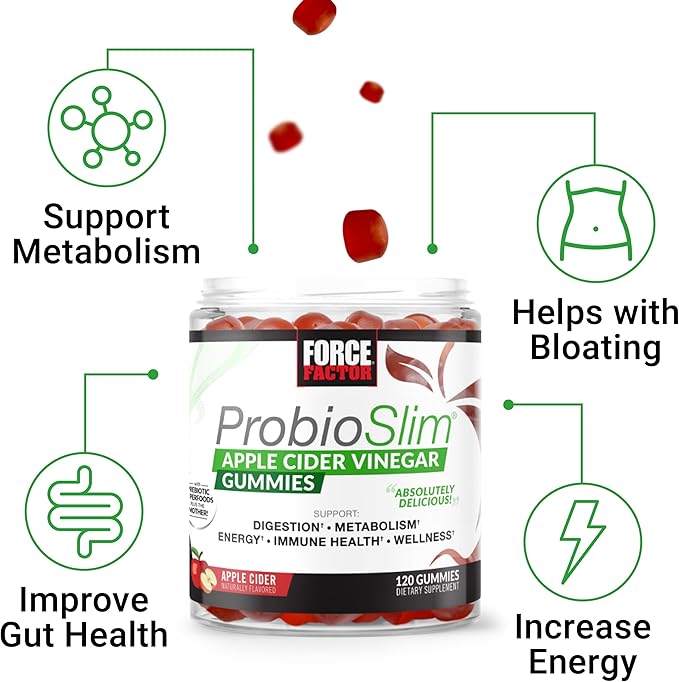 - INCREDIBLE BENEFITS: ProbioSlim Apple Cider Vinegar Gummies support digestion, metabolism, energy, immune health, wellness, and more. Each amazing little ACV gummy is packed with premium ingredients that produce impressive results.