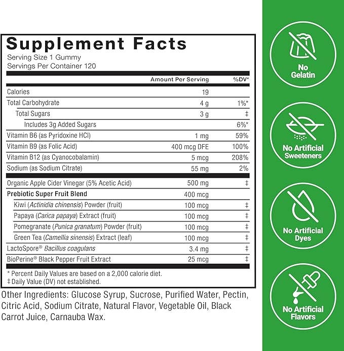 - Special Ingredients : Organic Apple Cider Vinegar, Bacillus coagulans, Green Tea Extract