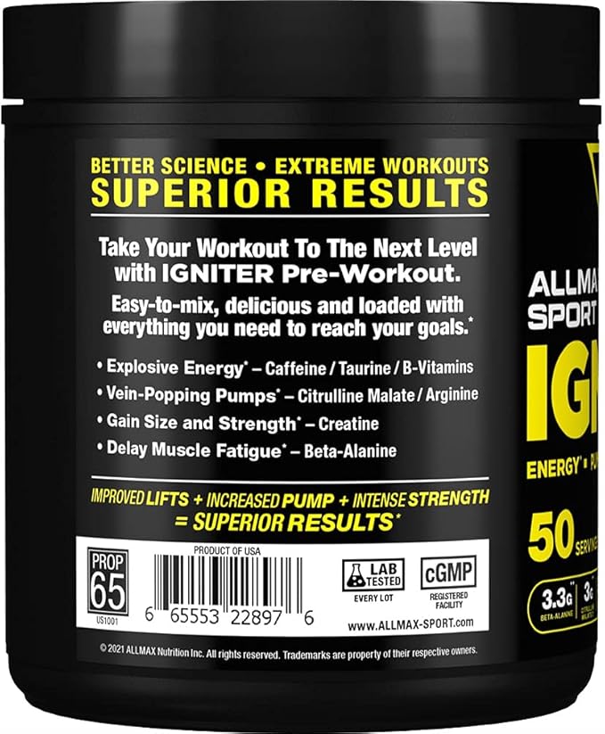 - SUPERIOR PRE-WORKOUT FORMULA - Take your workout to the next level with IGNITER SPORT. This pre-workout formula helps boost energy, pumps, and strength, all while delaying muscle fatigue.