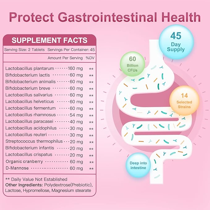 - HIGH POTENCY FOR 45 DAY SUPPLY: Women's probiotics are shipped with 90 tablets for a 45 day supply, contain 60 billion CFUs and 14 strains per serving to build up a stronger DIGESTIVE and IMMUNE system. More CFUs mean more effectiveness to balance the microbiome in your intestines to support female health. Our probiotic featured delayed-release and 3 layers protective technology, allowing strains to survive stomach acid and bile then reach deep into the intestine for optimized potency.