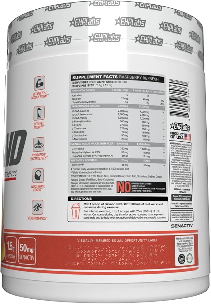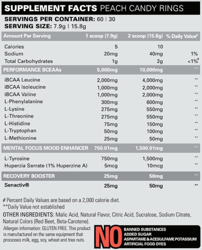 EHP Labs Beyond BCAA Powder Amino Acids Post Workout Recovery - BCAAs Essential Amino Acids EAA Supplements Powder - 10g Amino Acids Supplement for Muscle Recovery - 60 Servings (Peach Candy Rings)