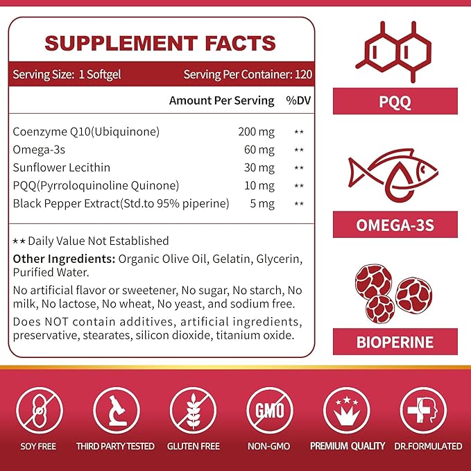 CoQ10-200mg-Softgels with PQQ, BioPerine & Omega-3, 120 Servings Coenzyme Q10(Ubiquinone) Supplement for High-Absorption, Powerful-Antioxidant, Support Heart & Energy-Production