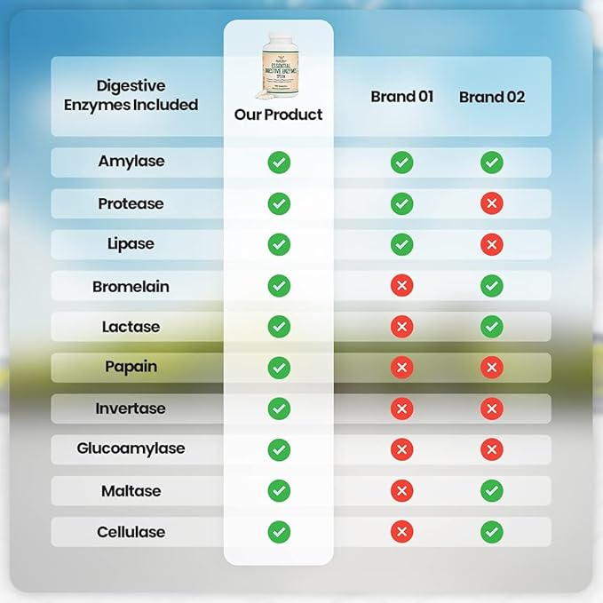 - CONTAINS ALL 10 MOST ESSENTIAL DIGESTIVE ENZYMES: No other digestive enzyme blend contains all 10 most essential digestive enzymes including Amylase, Lipase, Bromelain, Lactase, Papain, Protease, Cellulase, Maltase, Invertase, and Glucoamylase