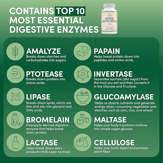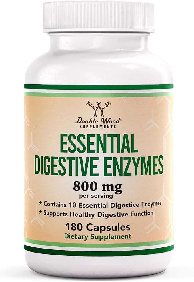 Digestive Enzymes - 800mg Blend of All 10 Most Essential Digestive and Pancreatic Enzymes (Amylase, Lipase, Bromelain, Lactase, Papain, Protease, Cellulase, Maltase, Invertase) by Double Wood