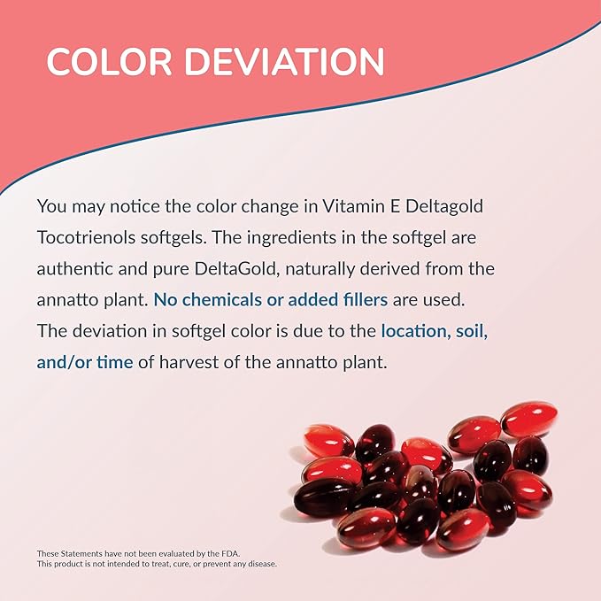 - Color Deviation : Softgel color variation is natural and reflects the pure, additive-free DeltaGold tocotrienols sourced from annatto plant, influenced by soil, location, weather, and harvest conditions.