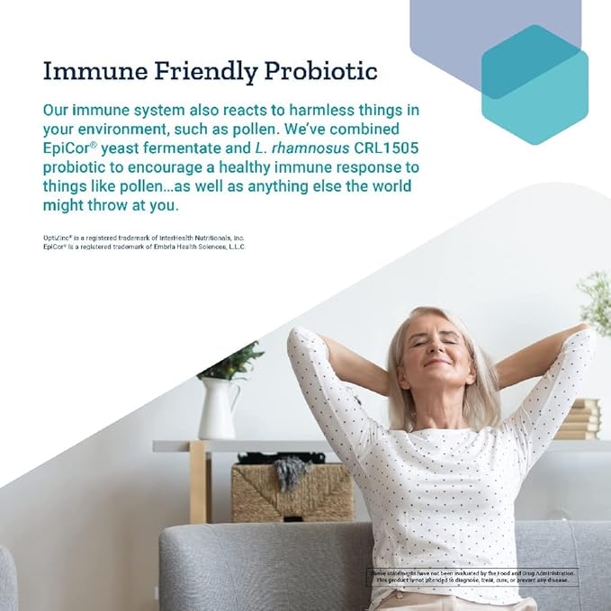 - Immune-friendly probiotic – This unique formula helps maintain comfortable nasal airflow and encourages a healthy immune response to both challenges and harmless things, including pollen.