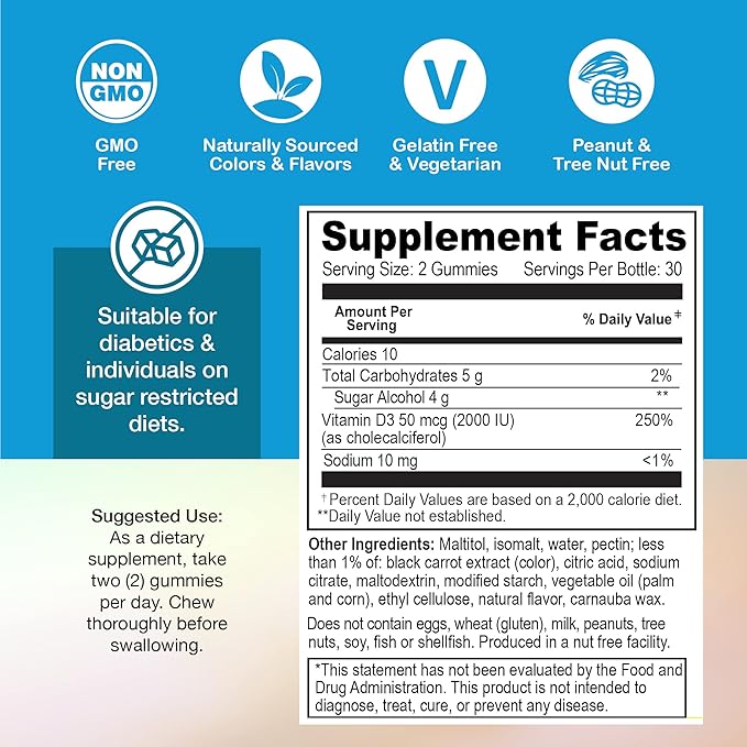 - HEALTH BENEFITS Our high potency Vitamin D3 provides ultra strength immune support, supports bone and tooth health, and aids in absorption of calcium. Each serving contains 250% of the recommended daily amount of Vitamin D3. Packed with nutritional value, get your daily dose of Vitamin D in a yummy way!