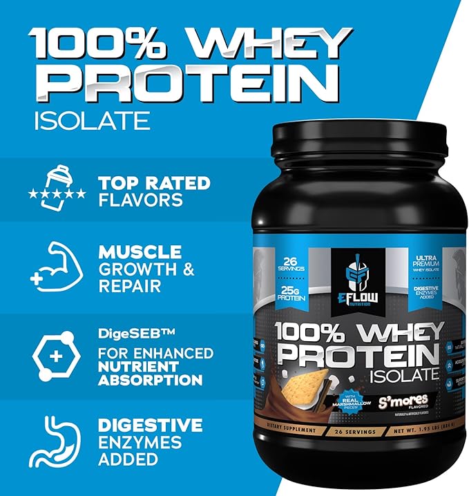 eFlow Nutrition 100% Whey Protein Isolate - Gluten & Lactose-Free Digestive Enzymes Added, Low Carb, Post Workout Shake, Fast Digesting for Optimal Muscle Recovery - S'Mores (26 Servings)