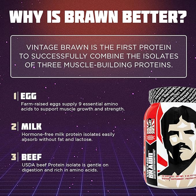 - π₯π₯©π₯ Three Protein Sources: Vintage Brawn is the first protein to successfully combine isolates of 3 muscle-building proteins: eggs, milk, and beef. Together, these are more effective than one source.