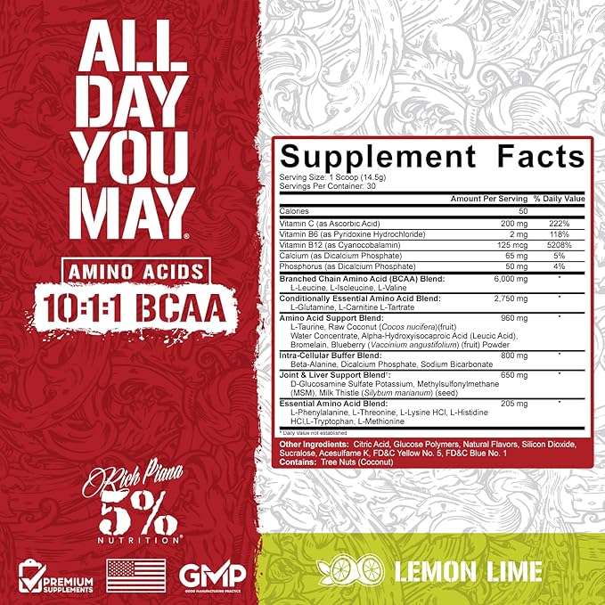 5% Nutrition Rich Piana AllDayYouMay BCAA Powder | Premium Intra & Post Workout Amino Acids, Hydration, Endurance, Muscle Recovery, Joint & Liver Support | 15.3 oz, 30 Servings (Lemon Lime)
