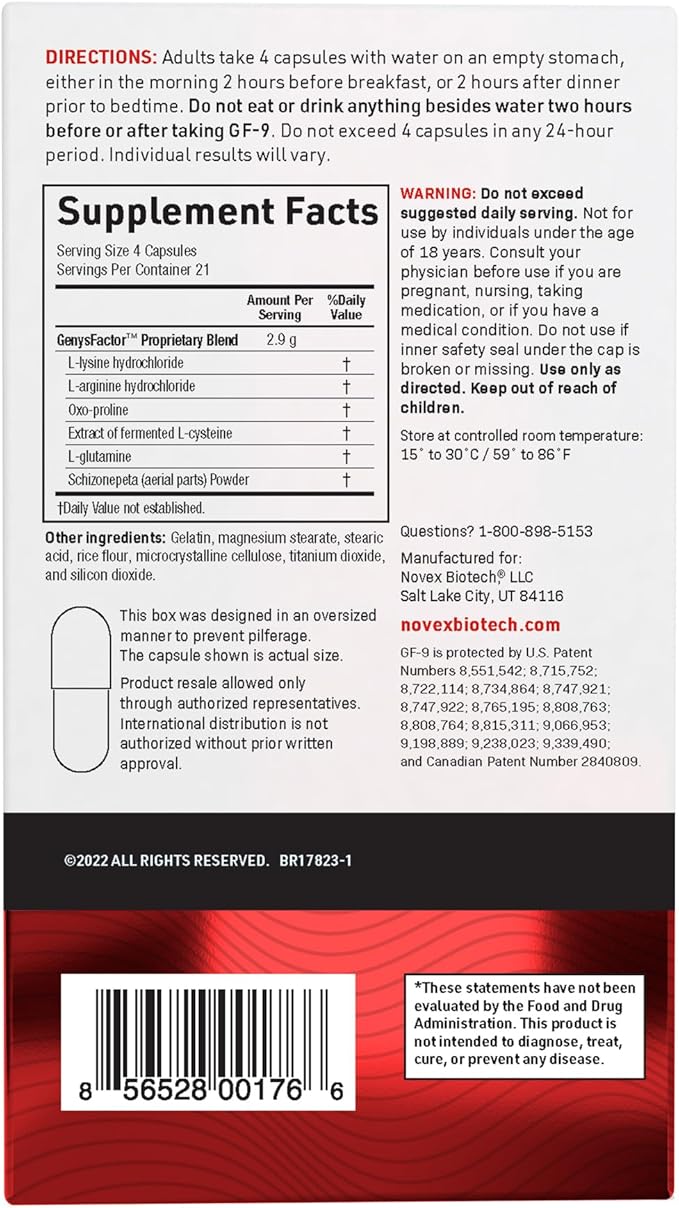 - SAFE TO USE & RESULTS GUARANTEED – Novex Biotech supplements are made in GMP certified facilities and are third-party verified. GF-9's exclusive formula is protected by 15 U.S. and International patents.