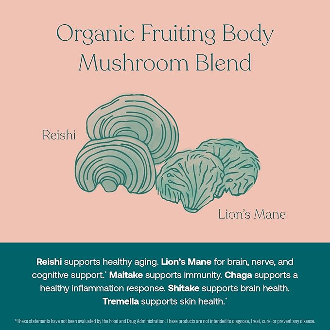 - ORGANIC MUSHROOM BLEND - We use extracts of certified organic mushrooms grown naturally on substrate materials native to each type exclusively from the fruiting body. Extracted to improve bioavailability with no grain fillers providing beta glucans and other compounds that support your health. A special blend of Reishi, Chaga, Shiitake, Lion's Mane and Tremella to support healthy aging, heart and brain health and beauty.