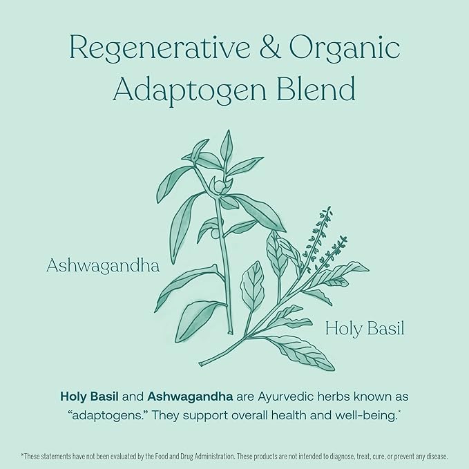 - MIND & BODY - Healthy soil produces high-quality, nutrient-dense ingredients. With an organic and regenerative adaptogenic Auryvedic herbal blend of holy basil and ashwagandha to help the body adapt to stress and support overall health and well-being. As we age our bones need a little extra love with vitamins D3 and K2 which together support healthy bone density, help you absorb calcium effectively and retain the calcium that’s already in your bones.