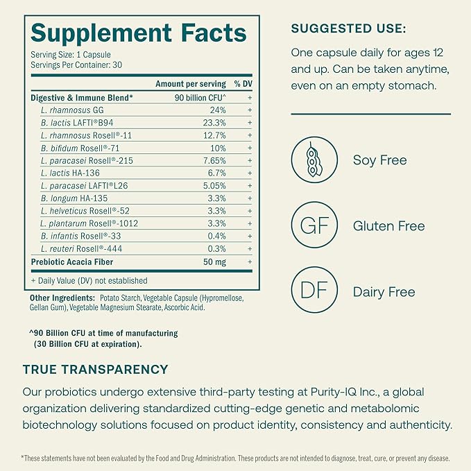 - TRUE TRANSPARENCY - It's important to know the specific probiotic strains and doses you're getting because different strains offer different benefits, which are dose dependent. We’ve selected the most rigorously researched probiotic strains shown to be effective and provide the exact percentage of the total CFU count made up of that specific strain. To offer you another layer of certainty, we use DNA testing to verify the probiotic strains and quantities in our targeted blends.