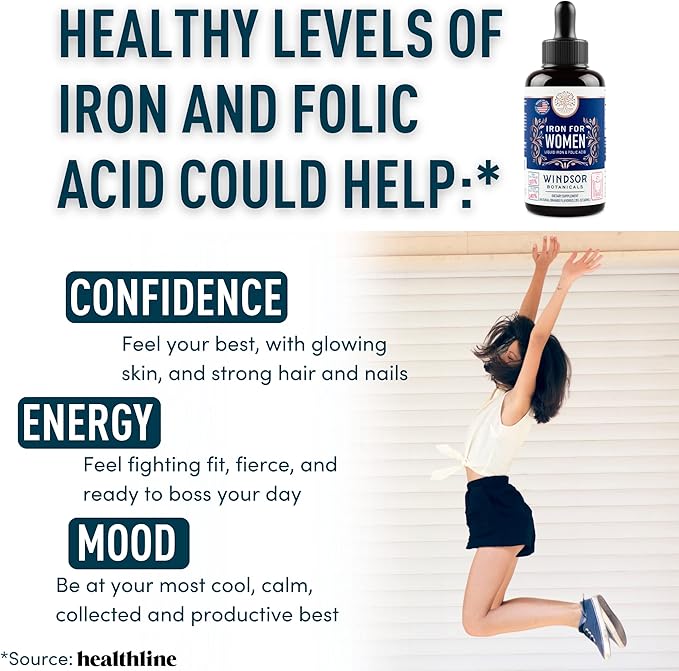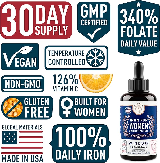 WINDSOR BOTANICALS Liquid Iron Supplements for Anemia - Folic Acid, Vitamin C, Vegan Iron Blood Builder and Anemia Supplement - 2 oz Orange Flavor Gentle Iron Drops for Women