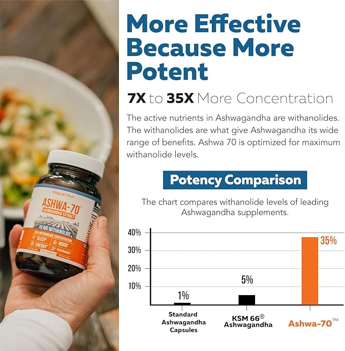 - 7X HIGHER WITHANOLIDES CONCENTRATION THAN KSM-66: Ashwa-70 provides 35% withanolide concentration compared to 5% concentration in KSM-66. Withanolides are the active nutrients in Ashwagandha.