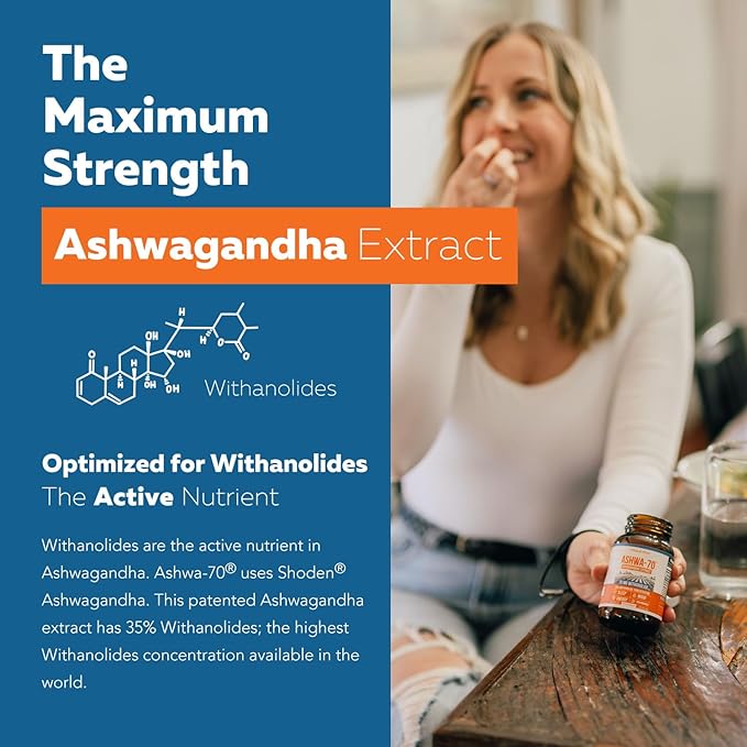 - 35% WITHANOLIDES CONCENTRATION - MOST POTENT ASHWAGANDHA EXTRACT: Withanolides are the active nutrient within Ashwagandha - they are what give Ashwagandha its power. Ashwa-70® contains the maximum available concentration of withanolides at 35% - with 70mg of withanolides per capsule.