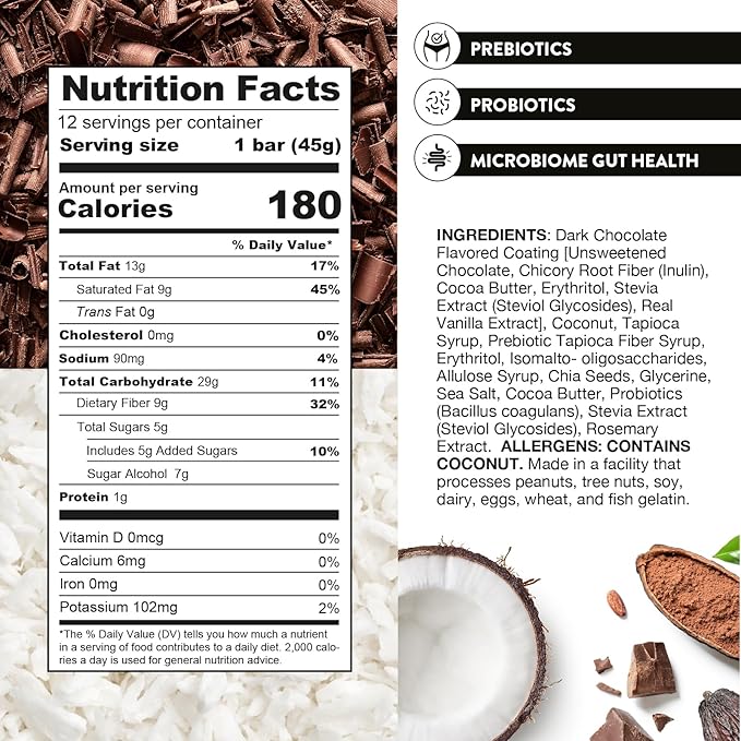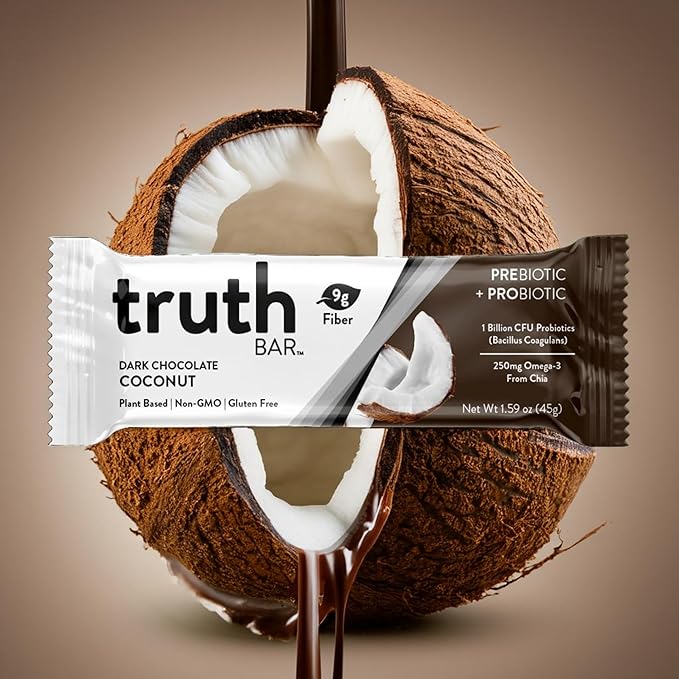 Truth Bar Prebiotic & Probiotic Keto Snack Vegan Bars with Omega-3's - Synbiotic High Fiber Snacks - Low Sugar, Kosher, Gluten Free - Dark Chocolate Coconut (Pack of 12)