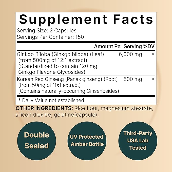 - Only 2 capsules per serving with 300 total high dosage capsules and up to a 5 month supply. 6,000mg ginkgo biloba herbal equivalent from a 500mg 12:1 extract with 500mg ginseng herbal equivalent from a 50mg 10:1 extract per dose.