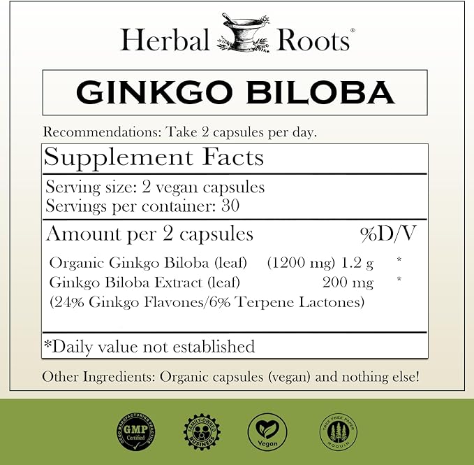Herbal Roots Ginkgo Biloba Made with Pure Organic Ginkgo Leaf - 1,400mg per Serving, 60 Vegan Capsules