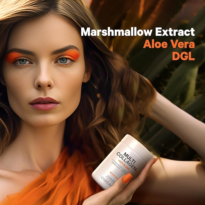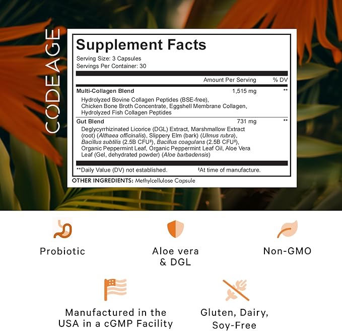- Aloe Vera Capsules & Organic Peppermint Leaf: Codeage Multi Collagen + Gut Blend formula also includes Aloe Vera as dehydrated powder, as well as organic peppermint leaf, slippery Elm, and marshmallow extract.