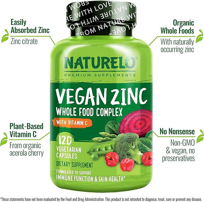 - Zinc Whole Food Complex: Our plant-powered formula combines 35 mg zinc from brown rice chelate with vitamin C from organic acerola cherry extract, plus an organic vegetable blend with whole foods like asparagus, beets, green peas, broccoli, okra, and spinach that typically contain naturally-occurring zinc.