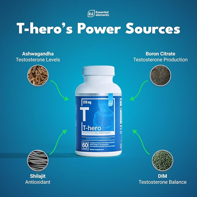 Essential Elements Male Health Supplement - Muscle Support & T-Health with DIM, Ashwagandha, Shilajit, More | T-Hero 60 Vegan Capsules (2-Pack)