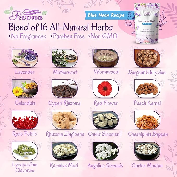 - PROMOTE YOUR FEMININE HEALTH - Fivona Blue Moon Recipe V Steam Blend is made with all natural herbs helpful to relieve irritated skin and reduce itching. It is perfect for soothing and healing the skin