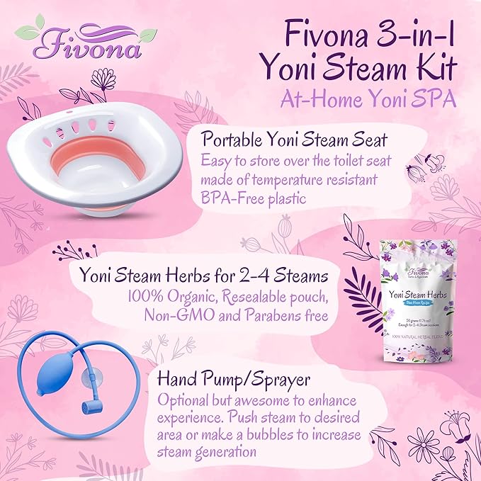 - 3 IN 1 BUNDLE YONI STEAM KIT - Fivona 3 in 1 Yoni Steam Kit bundle includes 1 Expandable Seat, 1 Hand Flusher and 1 Blue Moon Recipe Steam Herbs 1.76 oz. The kit includes a hand flusher which is optional to use to take the experience to the next level.