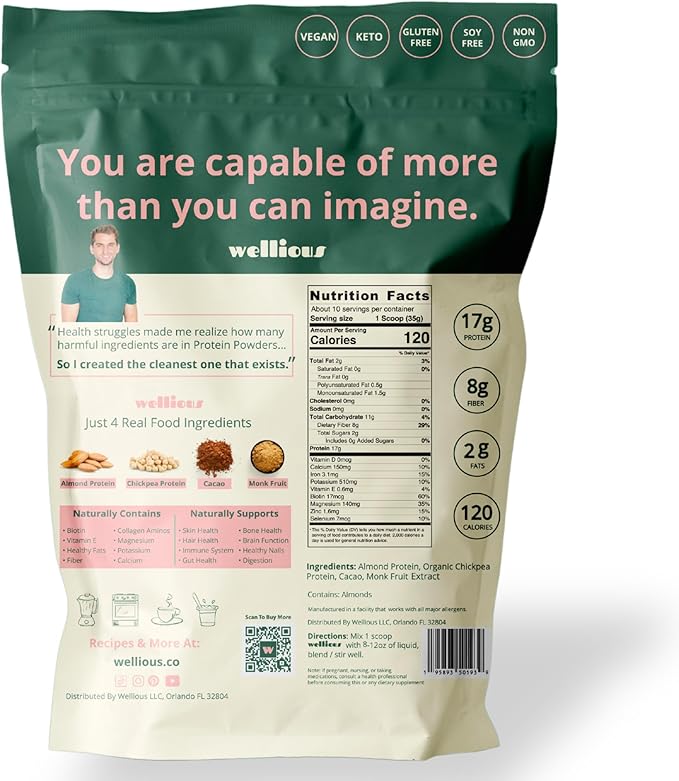 - CLEANEST INGREDIENTS - Made with just 4 real food ingredients. Wellious is the best clean protein powder sweetened with only monkfruit, and is a blend of almond protein and chickpea protein. We use real cocao to make real chocolate protein and real Madagascar vanilla beans to make real vanilla protein.